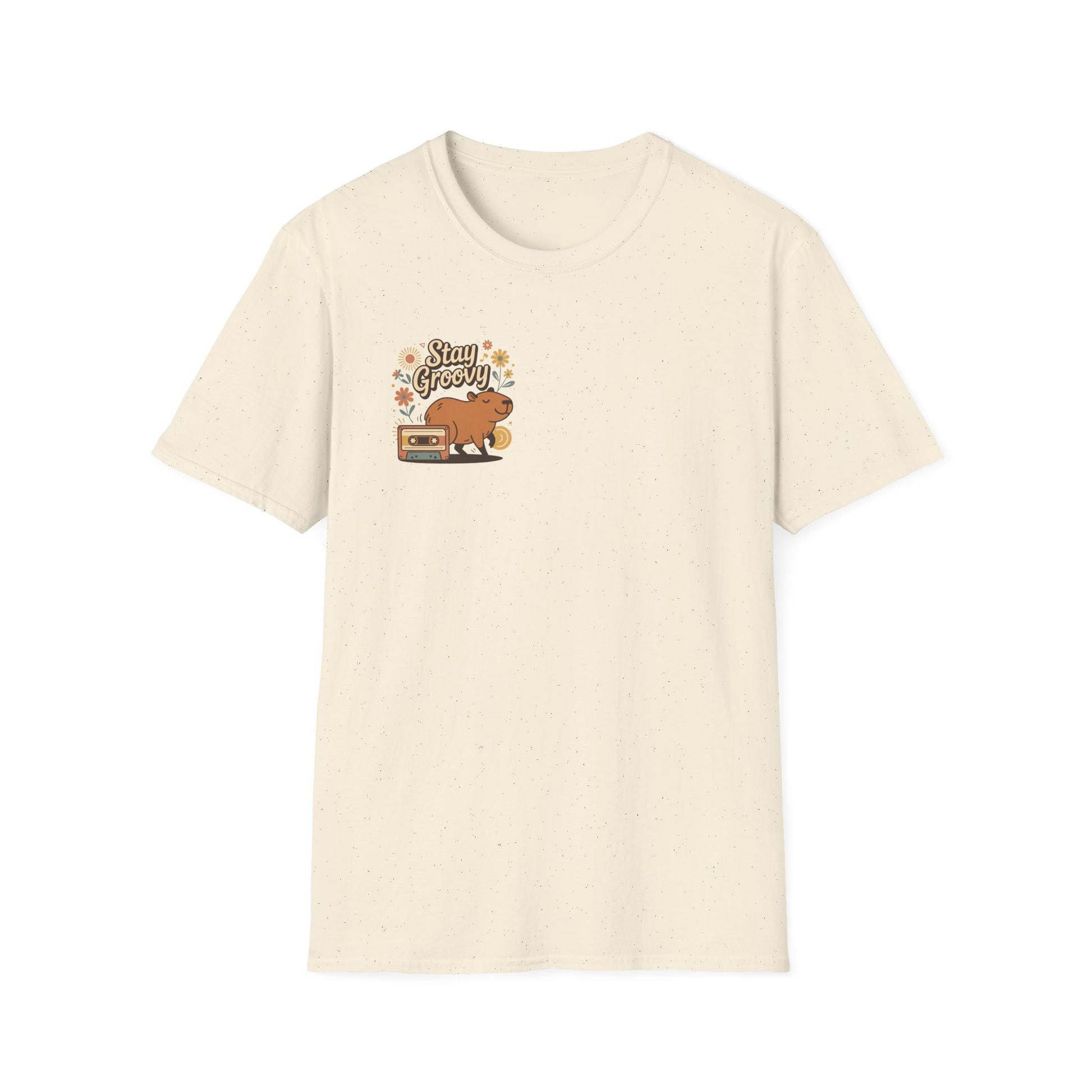 A soft, vintage-feeling tee that brings easygoing, retro energy to everyday wear. The lightweight, ring-spun cotton drapes comfortably while the natural flecked fabric gives a lived-in, relaxed look. Front and back illustrations — a mellow cartoon capybara beside a cassette player with flowers and warm tones — whisper of slow afternoons, vinyl vibes, and backyard hangouts. Wear it to unwind, to walk the neighborhood, or to slip on for low-key gatherings where good music and good company matter more than effort. The crew neckline and classic fit keep the silhouette timeless, while tear-away labeling and reinforced shoulders make it feel thoughtfully made.